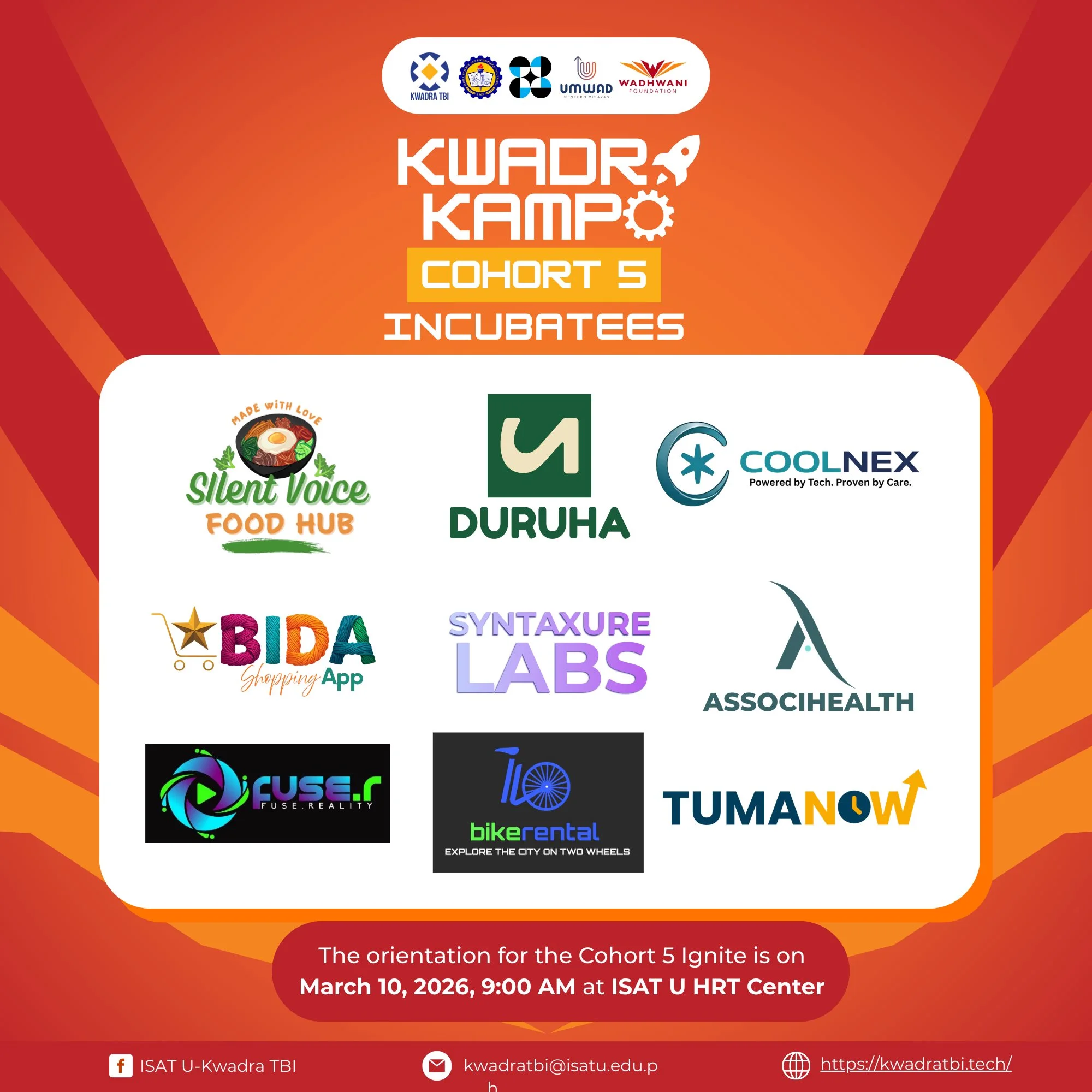 KwadraISAT U Kwadra TBI welcomes the 9 selected incubatees who will officially begin their startup journey under the Startup Pre-Incubation Program. This new cohort is composed of emerging innovators who will undergo mentorship, training, and guided startup development as they refine their ideas into viable ventures.